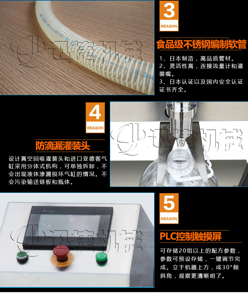 4、獨特的灌裝頭設計及真空回戲系統,確?,F場及包裝成品免受殘液污染,先快后慢雙速灌裝量可設備調節,解決了泵壓快速灌裝時的溢瓶現象。