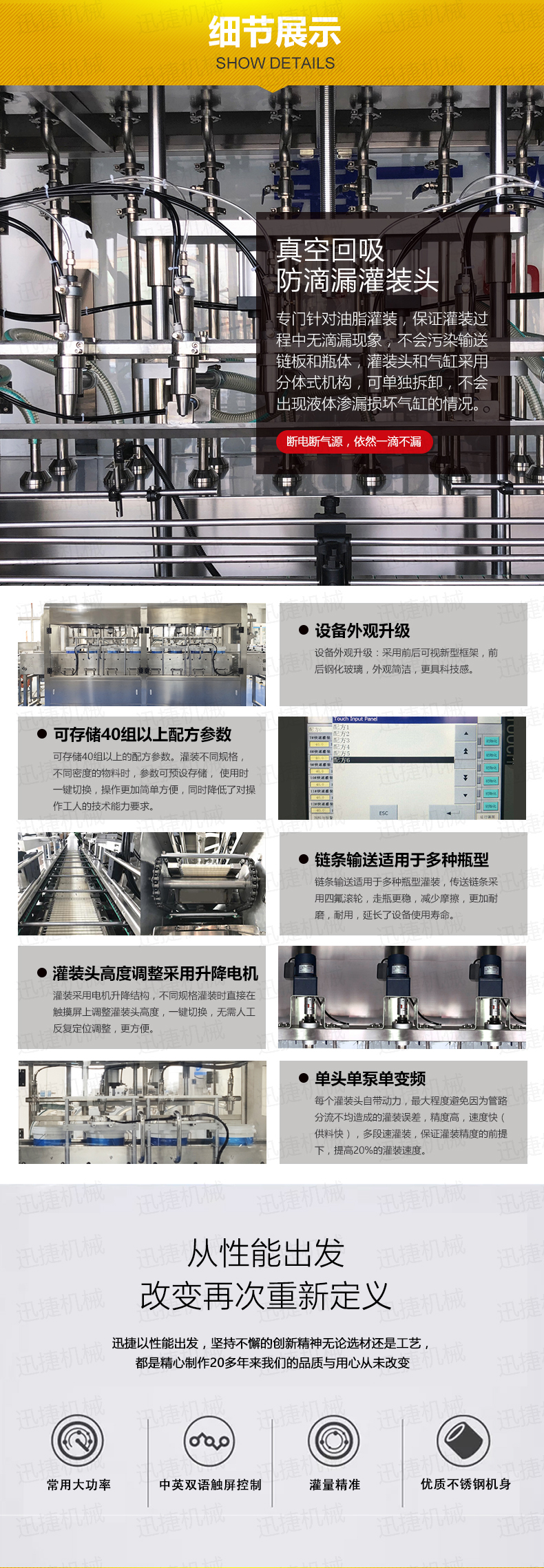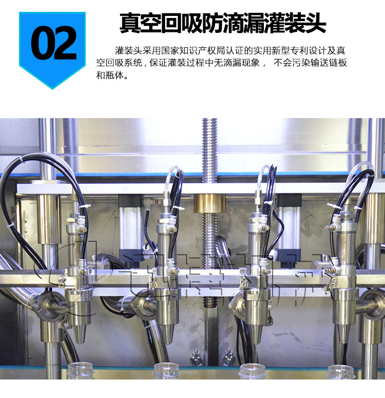 采用國家知識產(chǎn)權(quán)局認證的實用新型專利:真空回吸防滴漏灌裝頭;專利證號:ZL2013 2 0358214.7;專利認證時間為:2013年6月。專利設(shè)計及真空回吸系統(tǒng)專門針對食用油灌裝,保證灌裝過程中無滴漏現(xiàn)象,不會污染輸送鏈板和瓶體,灌裝頭和氣缸采用分體式機構(gòu),可單獨拆卸,不會出現(xiàn)液體滲漏損壞氣缸的情況。密封等配件使用標準件,更換維護簡單方便。灌裝完畢后,灌裝頭中空氣缸設(shè)計有自封結(jié)構(gòu),在一個生產(chǎn)班次結(jié)束時,在斷電斷氣源的下,依然一滴不漏。