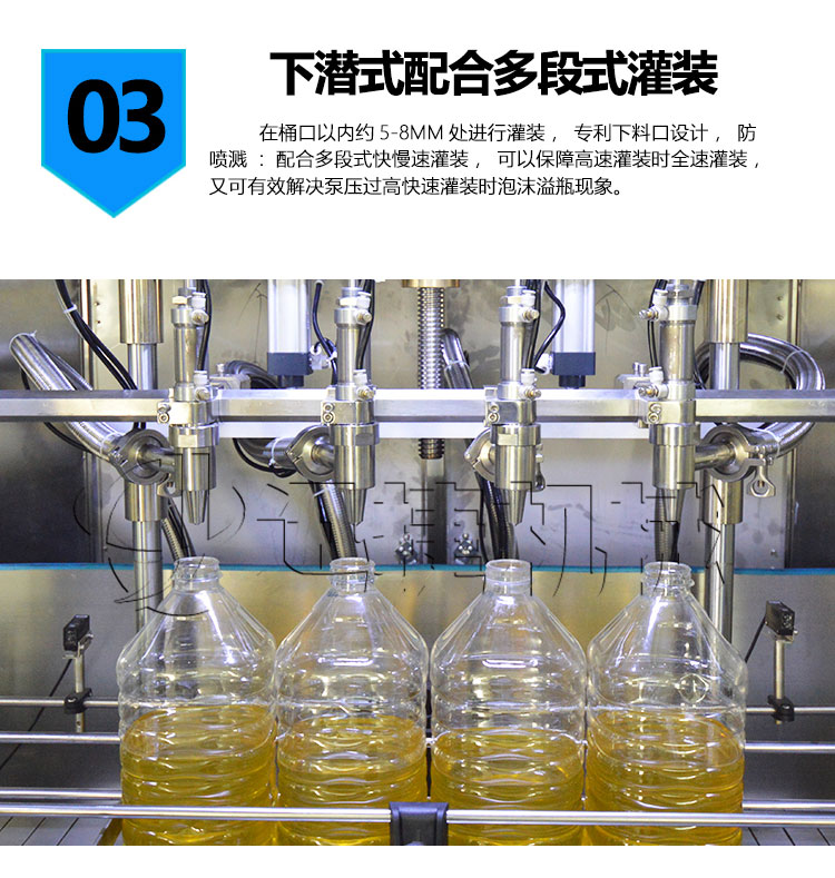 1.1-5L食用油包裝生產(chǎn)線采用獨立研發(fā)的單頭單泵灌裝方式,一個油嘴對應(yīng)一個計量泵,可以有效提高灌裝穩(wěn)定性及精度,也方便維修,變頻器調(diào)節(jié)雙速灌裝不溢油,灌裝完畢自動回吸不滴油。