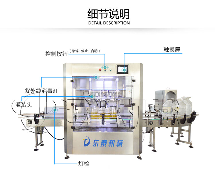 該灌裝機可以配置 高速旋蓋機 油桶貼標機 油瓶噴碼機 油壺自動自動裝箱碼垛機。組成油脂灌裝包裝流水線。高效、節(jié)能、自動化的設(shè)備。