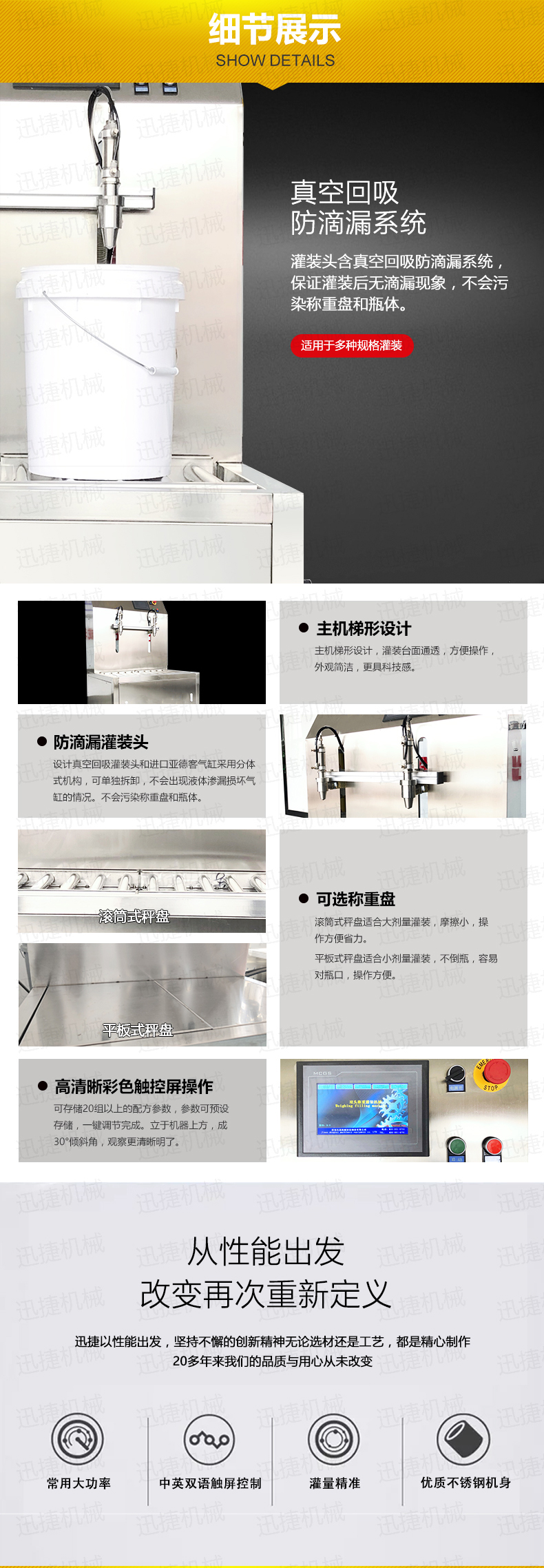 數(shù)字顯示灌裝容量,PLC微電腦程序控制,雙速灌裝控制技術(shù)電腦式定量、直線式灌裝防滴漏灌裝閥,不銹鋼制造