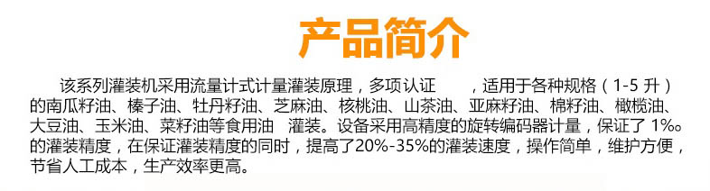 全自動油脂包裝成套設備油類全自動灌裝機產品簡介:      該系列灌裝機采用流量計式計量灌裝原理,多項認證,適用于各種規格(1-5升)的南瓜籽油、榛子油、牡丹籽油、芝麻油